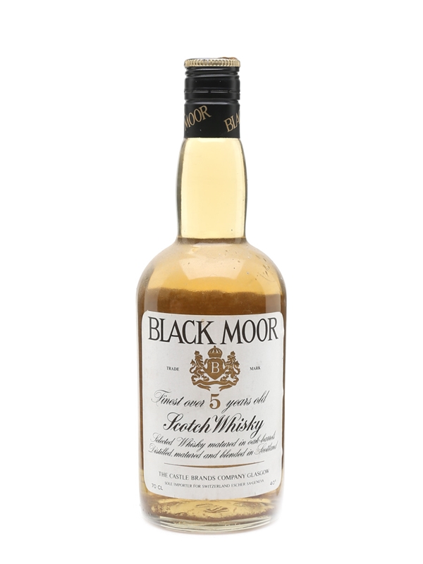 A bottle of Black Moor 5 Year Old blended Scotch whisky. This was produced for The Castle Brands Company, Glasgow and imported to Switzerland by Escher.
