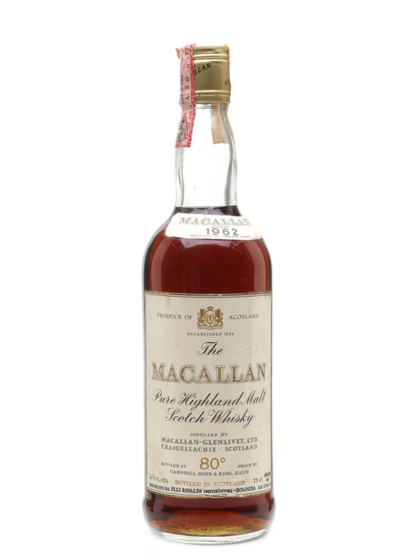 A bottle of The Macallan 1962, bottled by Campbell, Hope & King. This was bottled for the Italian market and imported by Rinaldi, we estimate in the late 1970s.