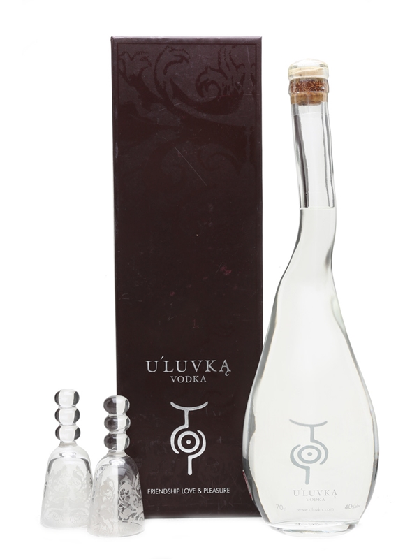 A bottle of U'luvka, a small batch Polish vodka, distilled from a mixture of rye, wheat and barley. This comes with two glasses and a book of cocktail receipe in presentation box.