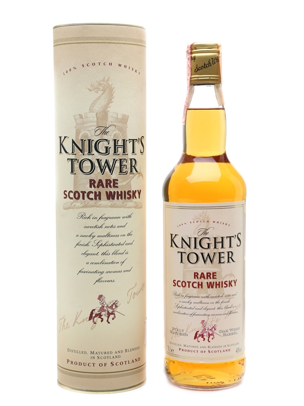 A bottle of The Knight's Tower rare Scotch whisky. This was produced and bottled in Scotland for Fratelli Gancia, Canelli, Italy by The BenRiach Distillery Company Ltd, Scotland. We estimate this was bottled in the 1990s.