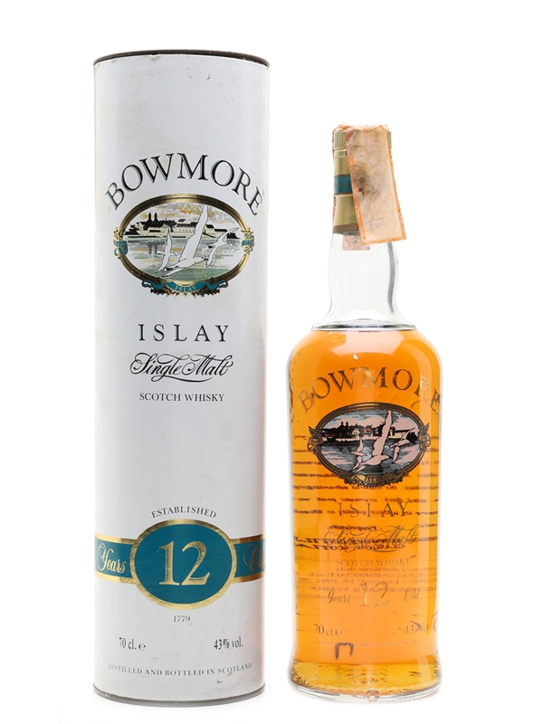 A bottle of Bowmore 12 Year Old with a screen printed label. We estimate this was bottled in the early 1990s.