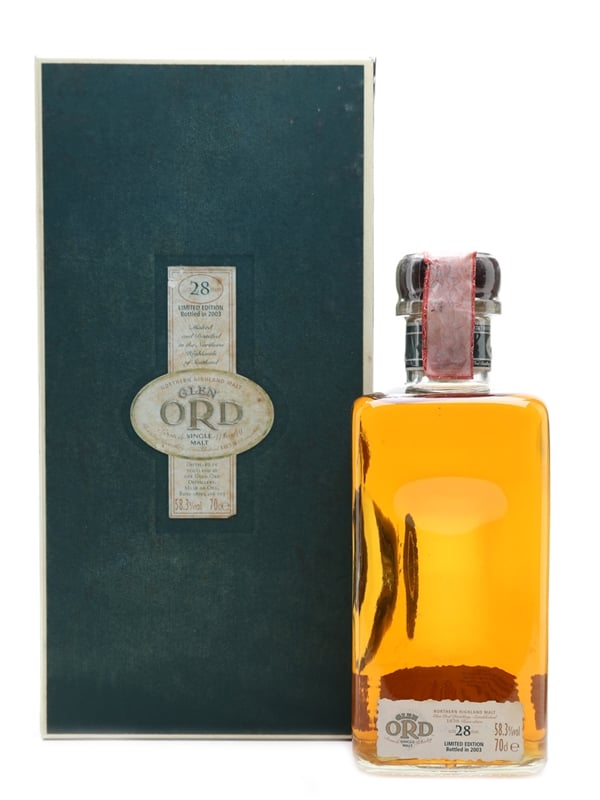 A bottle of Glen Ord 28 Year Old, bottled in 2003 at 58.3% ABV. Described by Jim Murray in the Whisky Bible as 'blisteringly beautiful'.