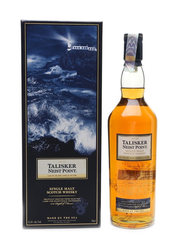 A bottle of Talisker Neist Point a blend of young and old whiskies. This was named after a lighthouse on the west coast of Skye.
