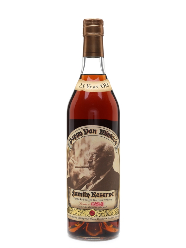 A bottle of Pappy Van Winkle's 23 Year Old Family Reserve.
