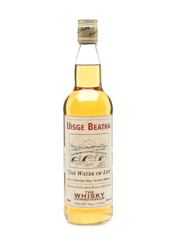 A bottle of Uisge Beatha, a single Speyside malt specially bottled for The Whisky Connoisseur. The distillery is not named but the water source is the River Tromie, which supplies The Speyside distillery.