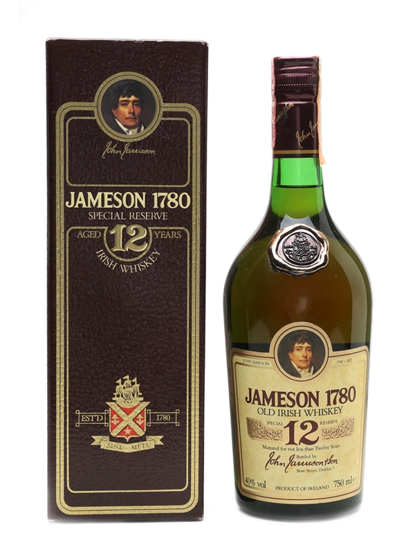 A bottle of Jameson 1780 12 year old. This release is named for the year that Jameson's Bow Street distillery was founded. We estimate this was bottled in the 1980s.