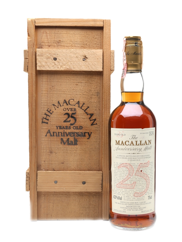 A bottle of The Macallan 25 Year Old, distilled in 1964 and matured in sherry casks. This was bottled in 1989 for Italian importer Giovinetti as part of The Macallan's Anniversary Malt series.