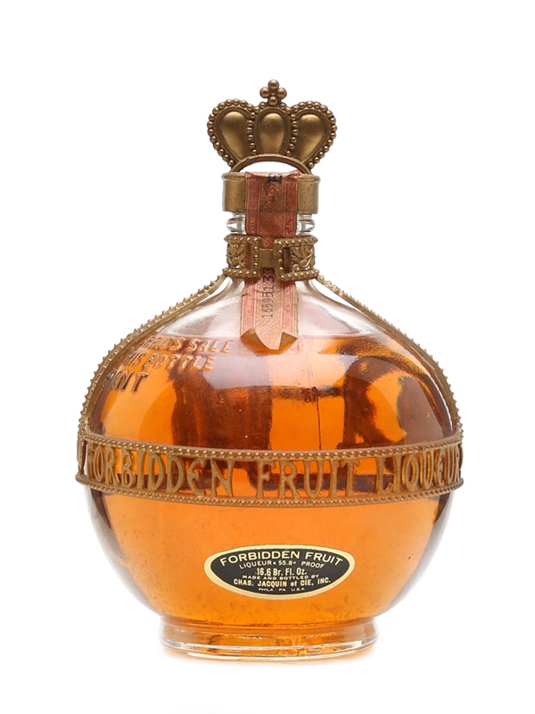 A 47.3cl bottle of Jacquin's Forbidden Fruit liqueur from Philadelphia. A popular cocktail ingredient in the first half of the 20th century, Jacquin & Co. discontinued Forbidden Fruit in the 1970s before introducing Chambord a few years later in the same spherical bottle.