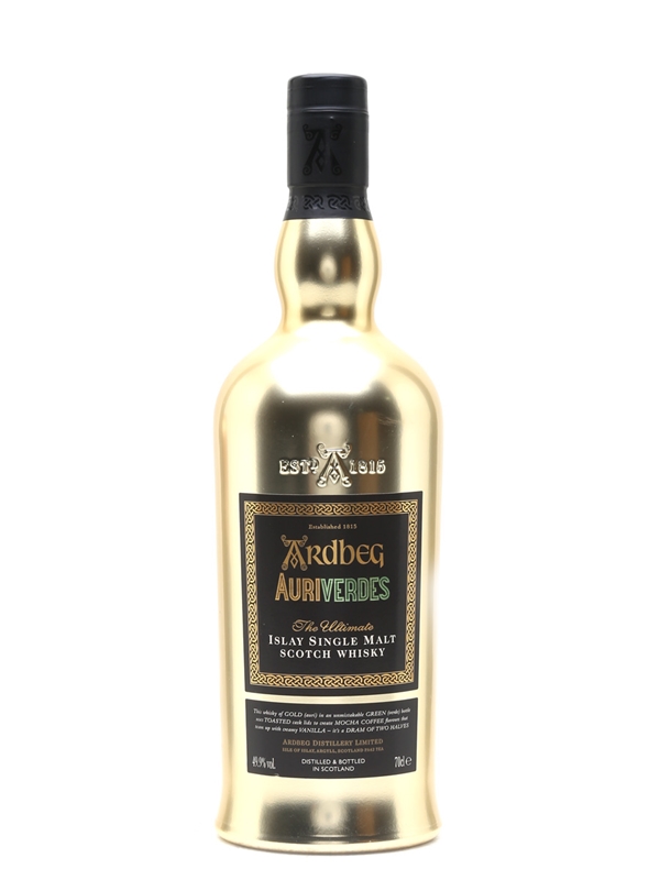 A bottle of Ardbeg Auriverdes, presented in a gold coloured bottle that was only made available to select journalists and bloggers. This was bottled for Ardbeg Day at Feis Ile on 31 May 2014.