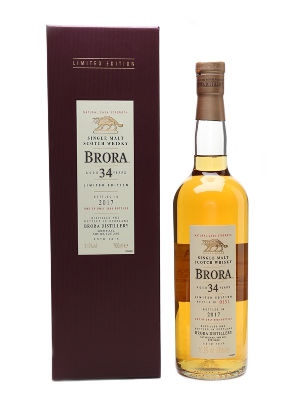 A limited edition bottle of Brora 34 Year Old, the 16th edition in Diageo's Special Releases series. This was distilled the year before Brora closed in 1983, and was bottled at cask strength in 2017.