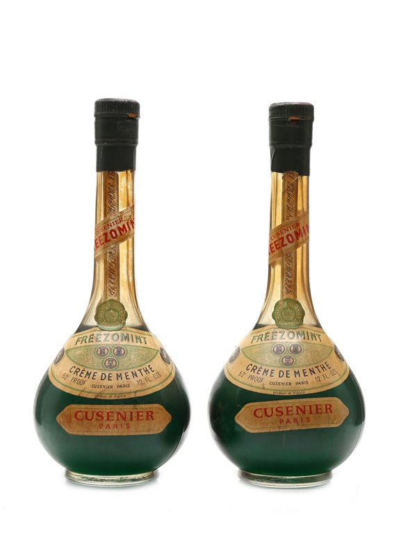 This lot contains two bottles of Cusenier Freezomint Crème de Menthe. We estimate these were bottled in the 1960s.
