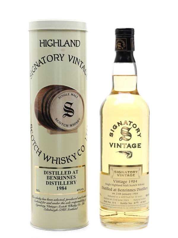 A bottle of Benrinnes 20 Year Old. This was distilled on 25 January 1984, matured in a refill butt, and bottled on 23 June 2004 by Signatory Vintage.