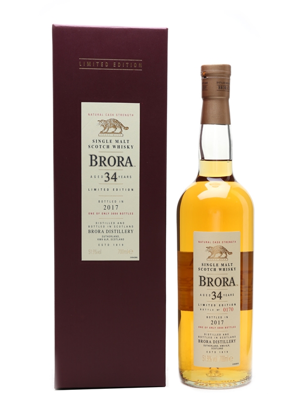 A limited edition bottle of Brora 34 Year Old, the 16th edition in Diageo's Special Releases series. This was distilled the year before Brora closed in 1983, and was bottled at cask strength in 2017.