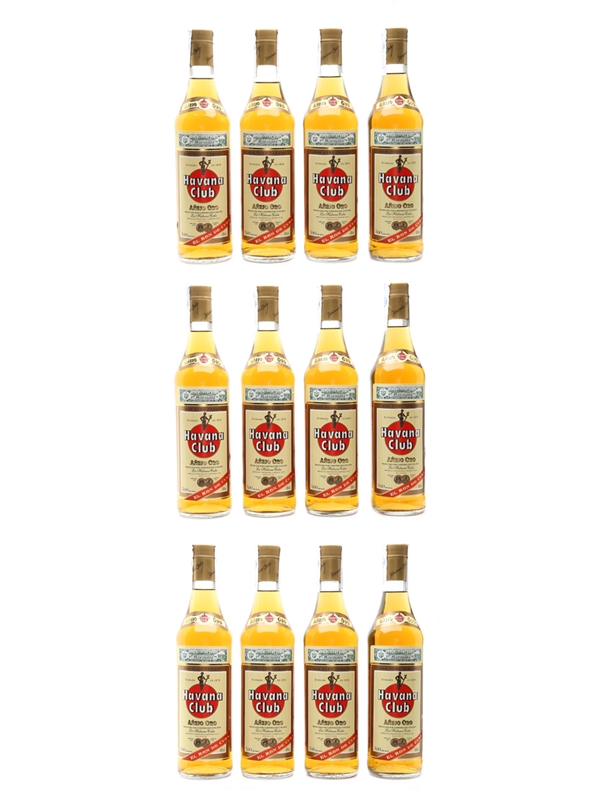 A case of 12 bottles of Havana Club Añejo Oro rum from Cuba, presented in the original cardboard box. These were bottled for the Spanish market, we estimate in the 1990s.