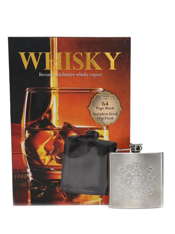 A set containing a stainless steel hip flask, and a 64 page book: Whisky - Become a definitive whisky expert.