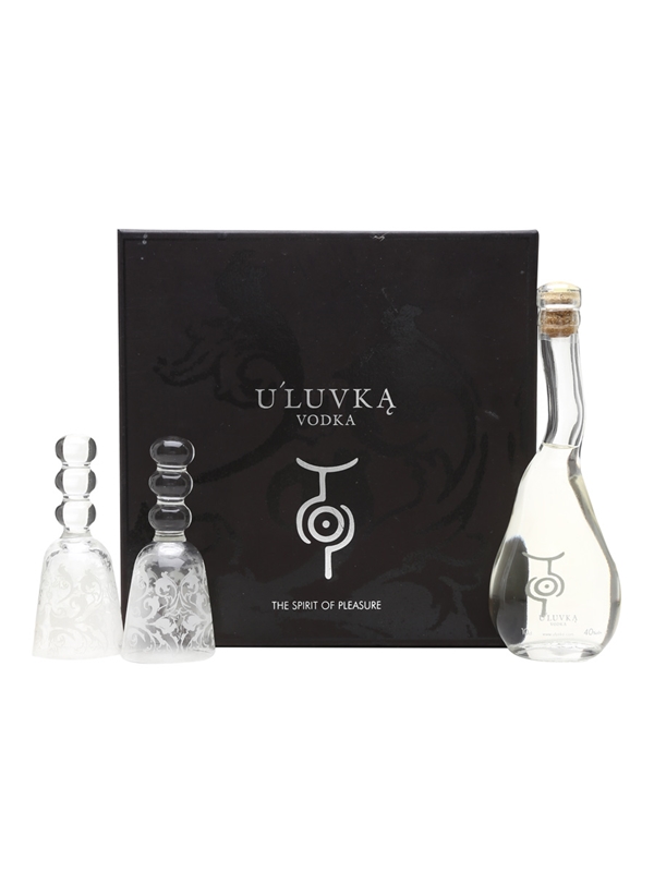 A 10cl bottle of U'luvka, a small batch Polish vodka, distilled from a mixture of rye, wheat and barley. This comes with two glasses and a book of cocktail receipe in presentation box.