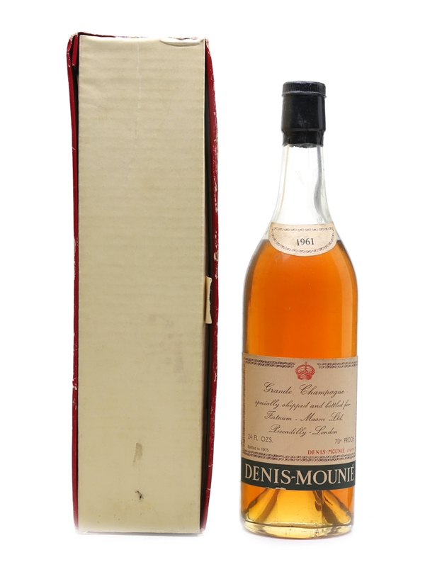 A bottle of Denis-Mounie 1961 Grande Champagne Cognac, specially shipped and bottled for Fortnum & Mason Ltd., Piccadilly, London. This was bottled in 1975.