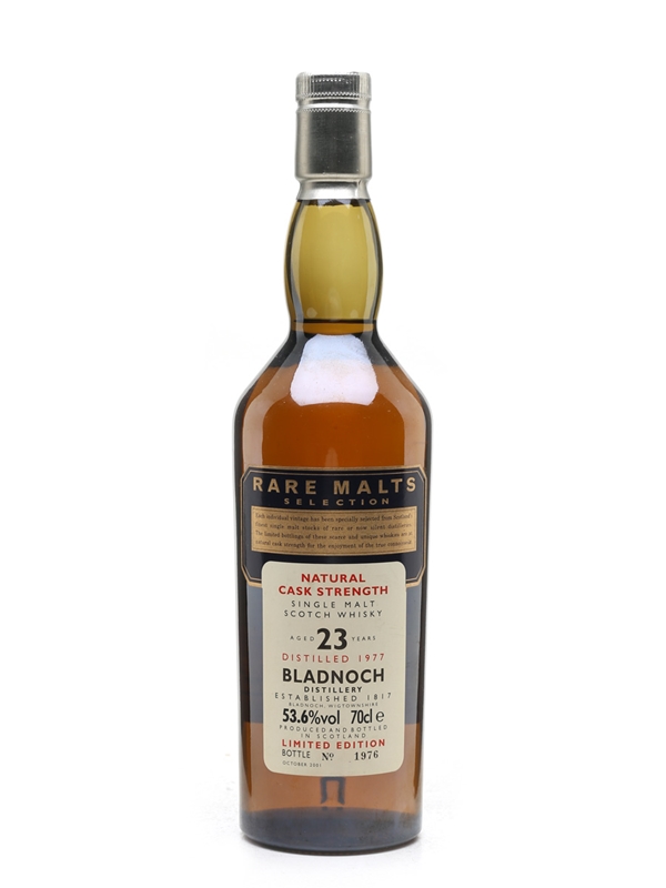 A bottle of Bladnoch 23 Year Old. This was distilled in 1977 and bottled in October 2001 for Diageo's now-discontinued Rare Malts Selection.