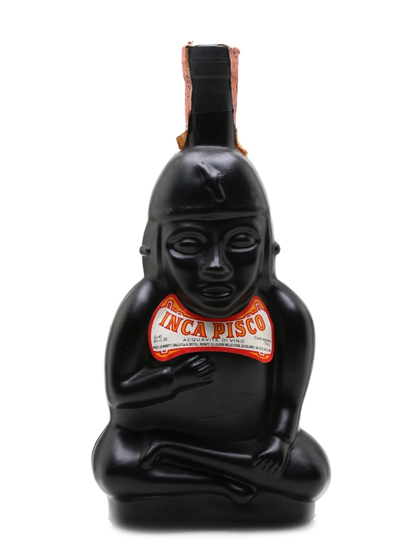 A bottle of Inca Pisco, produced in Italy. The bottle is in the shape of an Inca statue. We estimate this was bottled in the 1960s or 1970s.