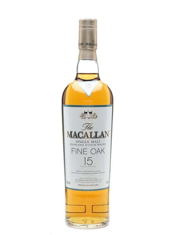 A bottle of The Macallan 15 Year Old from the Fine Oak range. This was matured in a combination of bourbon and sherry casks.