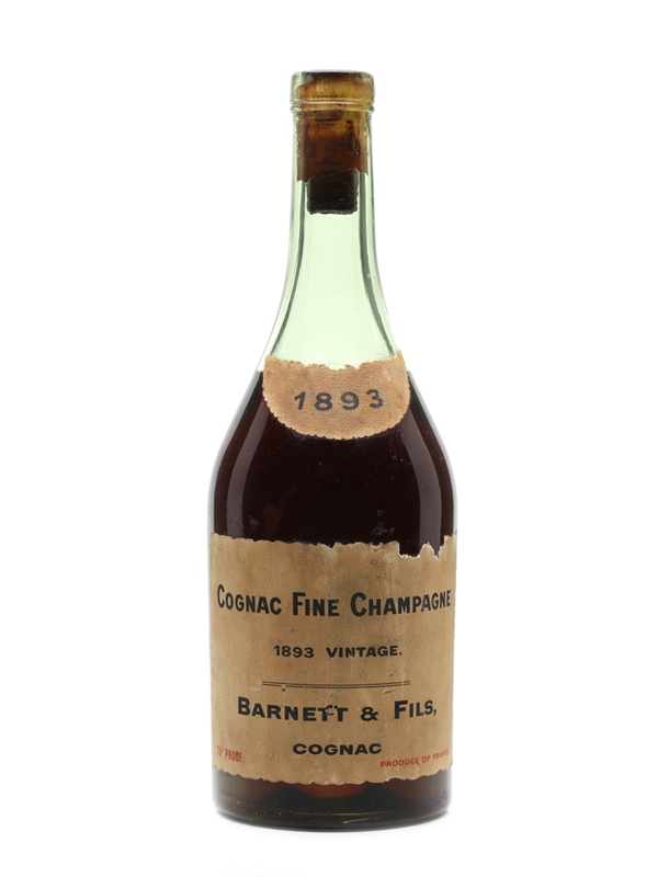 A bottle of Barnett & Fils 1893 Fine Champagne Cognac from France, sealed with a driven cork.