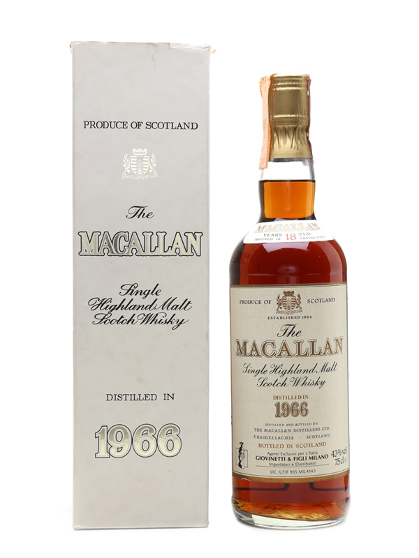 A bottle of The Macallan 18 Year Old, distilled in 1966 and imported for the Italian market by Giovinetti & Figli.