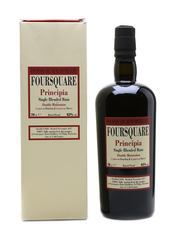 A bottle of Foursquare Principia 9 Year Old Single Blended rum from Barbados. This rum was distilled in 2008, matured in two types of cask, spending three years in ex-bourbon barrels, and six years in ex-sherry casks, before blending and bottling in November 2017 by Velier.