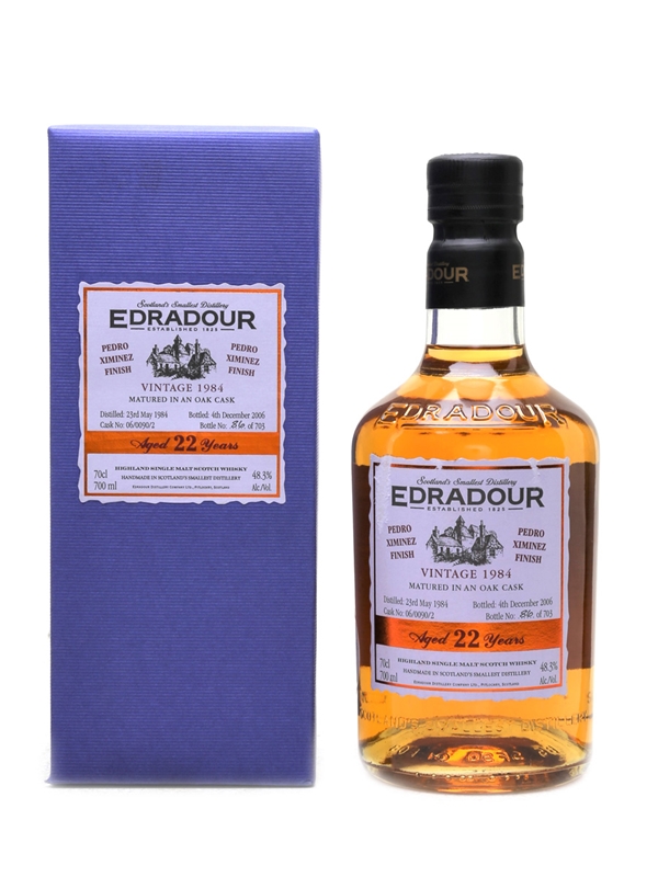 A bottle of Edradour 22 Year Old single malt Scotch whisky. This was distilled on 23 May 1984, matured in a plain hogshead for more than 21 years, than for finishing filled in to Pedro Ximenez sherry butt for further 10 months and bottled on 4 December 2006.