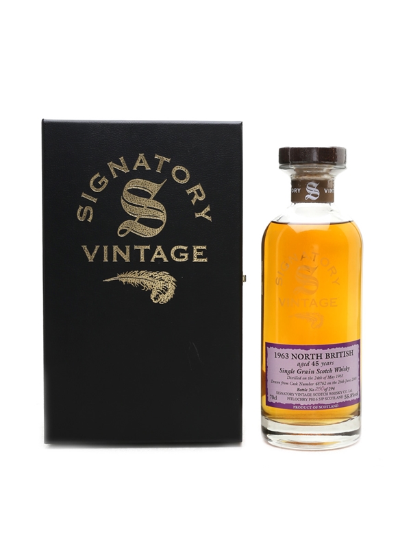 A bottle of North British 45 Year Old single grain Scotch whisky. This was distilled on 24 May 1963, matured in a single refill sherry butt, and bottled on 26 June 2008 by Signatory Vintage.