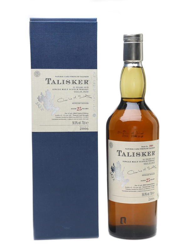 A bottle of Talisker 25 Year Old, bottled in 2006 at 56.9% ABV.