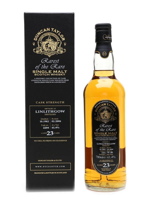 A bottle of Linlithgow 23 Year Old from Duncan Taylor's Rarest of the Rare series, which exclusively features cask strength single cask whiskies from distilleries which no longer exist.