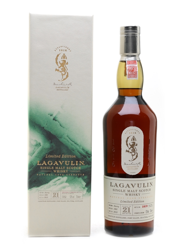 A limited edition bottle of Lagavulin 21 Year Old. This was distilled in 1991, finished in sherry casks, and bottled in 2012.