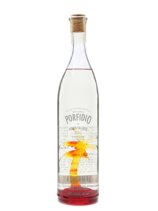A bottle of Porfidio full strength Plata rum, produced in Mexico from sugar-cane juice. This is presented in a hand-made bottle with glass palm tree.