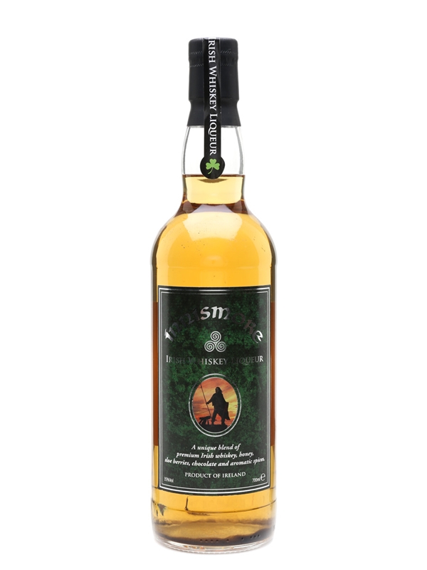 A bottle of Innismore Irish whisky liqueur, made from Irish whiskey, honey, sloe berries, chocolate and aromatic spices.