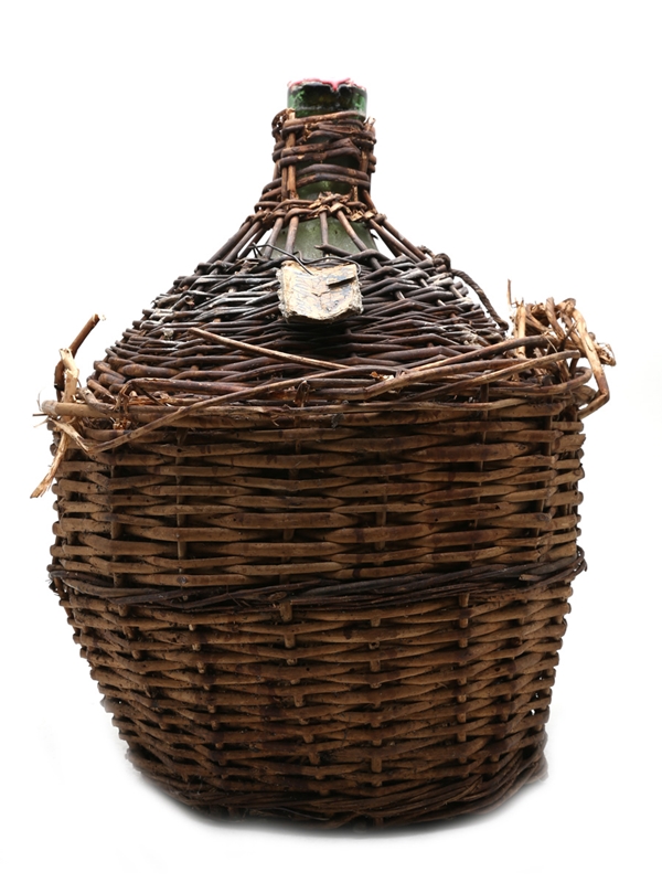 A large bottle of French rhum, presented in a glass bottle with a wicker casing. There is very little information on the bottle, the tag appears to carry the following text (some characters are not legible):