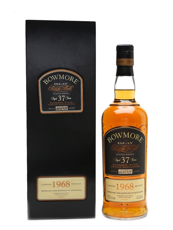 A bottle of Bowmore 37 Year Old Islay single malt whisky. This was distilled in 1968, matured in bourbon casks, and bottled at cask strength.