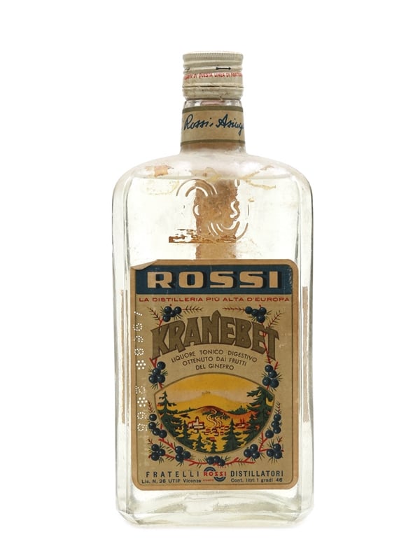 A litre bottle of Rossi Kranebet, a tonic liqueur made from juniper and other alpine herbs. This was produced at the highest distillery in Europe (at the time), we estimate in the 1960s.