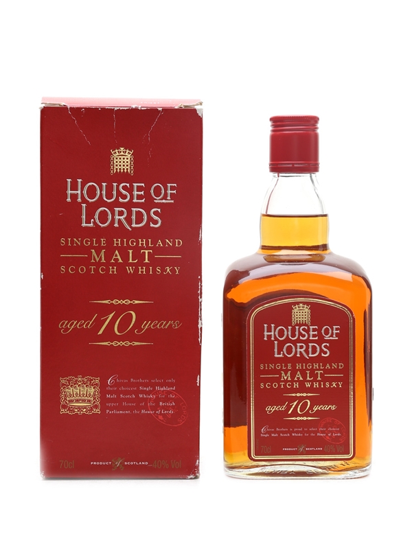 A bottle of House of Lords 10 Year Old single Highland malt. This was distilled at an undisclosed distillery and selected by Chivas Brothers for the upper house of the British Parliament, the House of Lords.