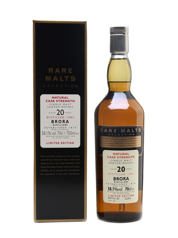 A bottle of Brora 20 Year Old. This was distilled in 1982 and bottled in April 2003 for Diageo's now discontinued Rare Malts Selection range.