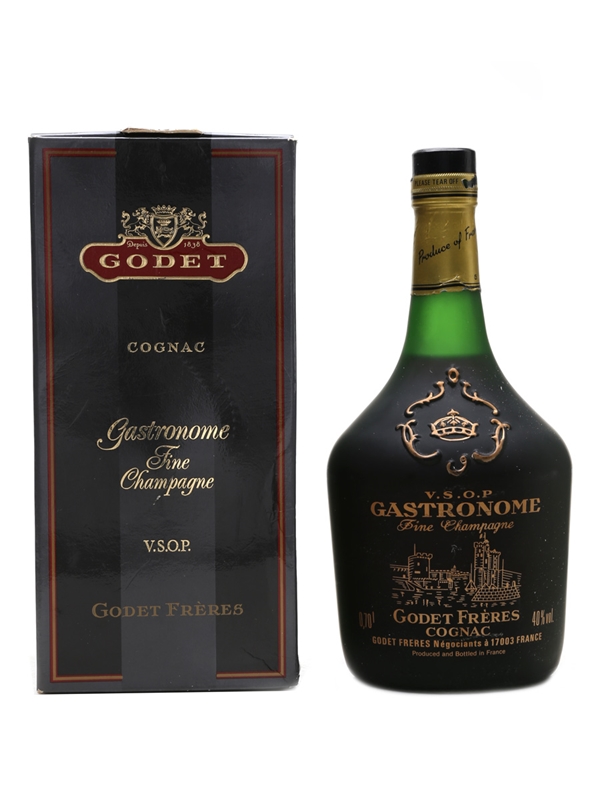 A bottle of Godet Frères VSOP Gastronome Cognac, made from grapes grown in the Grande and Petite Champagne regions of Cognac. We estimate this was bottled in the 1990s.