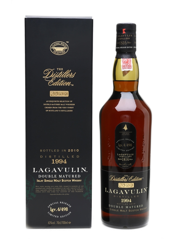 A bottle of Lagavulin 1994 that was bottled in 2010 for the Distillers Edition series.