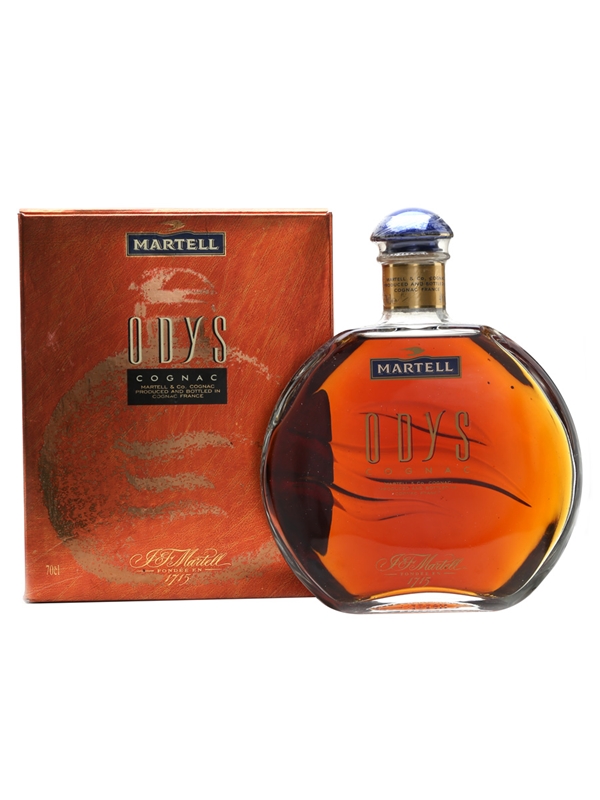 A bottle of Martell Odys Cognac, presented in a round decanter.