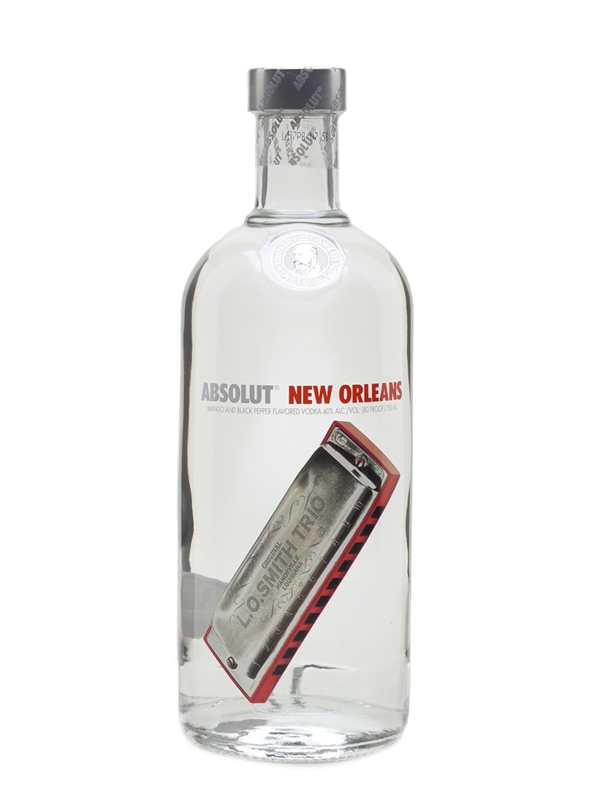 A 2007 limited edition bottle of Absolut New Orleans, a Swedish vodka flavoured with mango and black pepper. This was imported to the US by Absolut Spirits Co., New York.