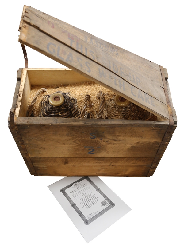 Please see images for fill level and label condition. Note wear to the wooden crate. This was sealed on arrival at our offices, and was partially opened by us to inspect the contents.