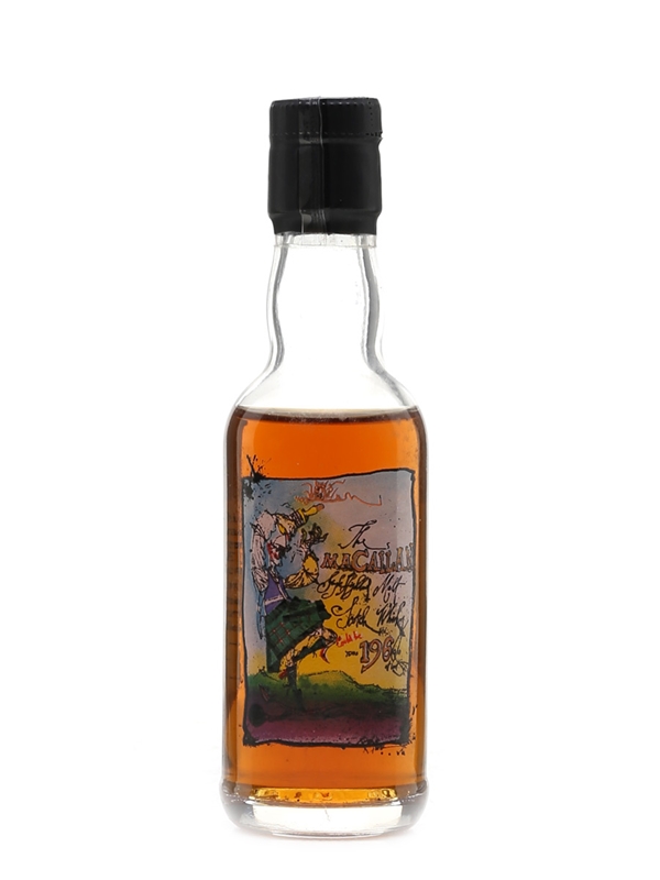 A miniature bottle of The Macallan, released in 1996 to celebrate the 35th anniversary of satirical magazine, Private Eye. This is a vatting of casks selected by whisky maker FA Newlands and includes a cask from 1961, the year Private Eye was founded.