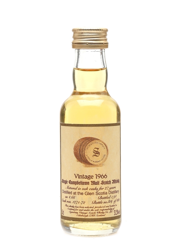 A miniature bottle of Glen Scotia 27 Year Old. This was distilled in April 1966, matured in oak casks, and bottled in January 1994 by Signatory.