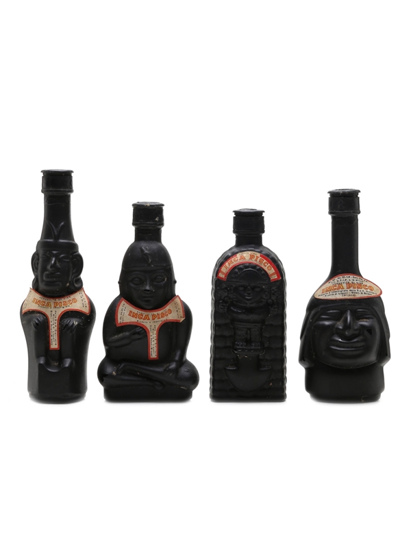 This lot contains four bottles of Inca Pisco, produced in Italy by Riunite di Liquori under the authorisation of Mario Ranuzzi, Peru. Each bottle is shaped like an Inca statue. We estimate these were bottled in the 1960s to 1970s.