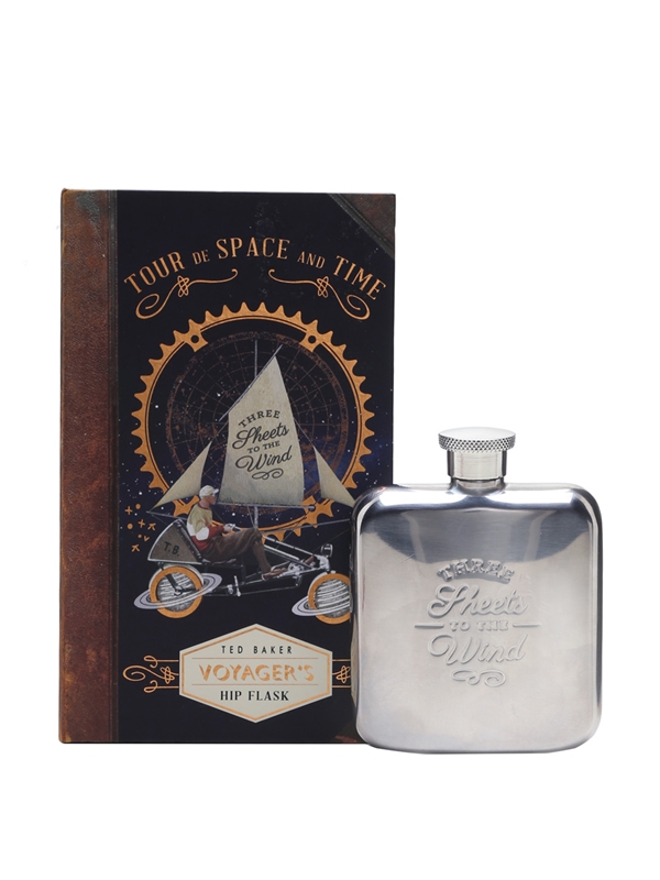 A stainless steel Ted Baker Voyager's Hip Flask, Three Sheets to the Wind. This is presented in a book shaped box.
