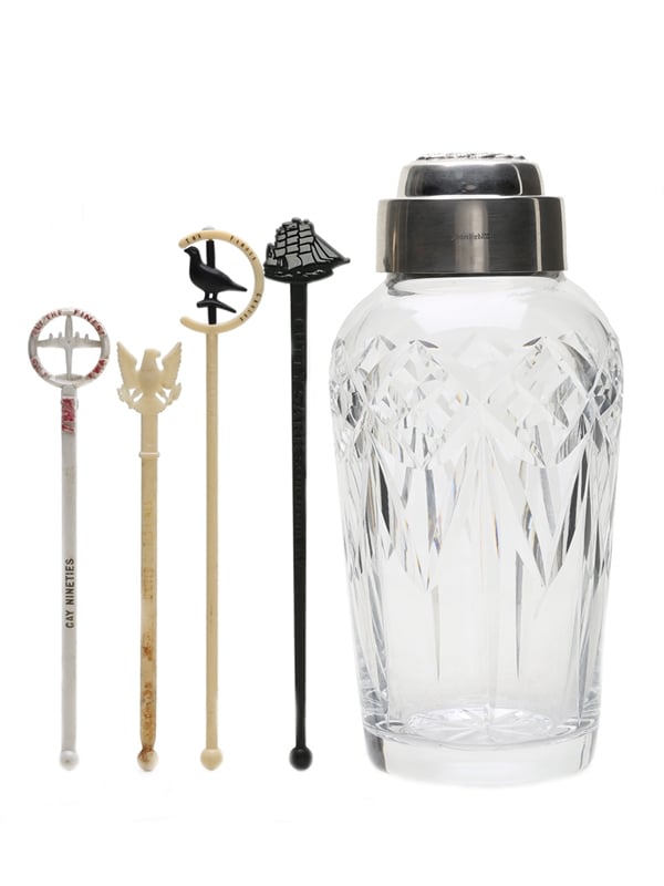A Waterford crystal cocktail shaker with silver plated lid and collar. This includes four branded stirrers, including The Famous Grouse and Cutty Sark.