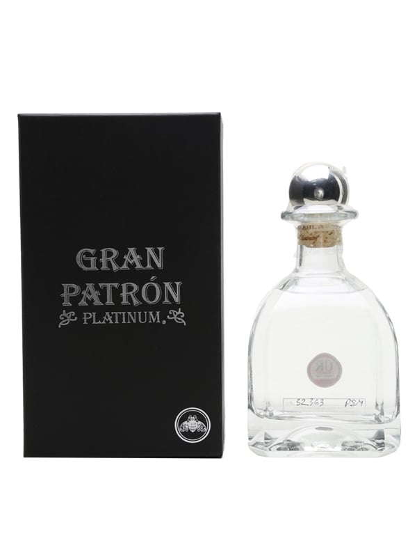 A bottle of Gran Patron Platinum, a premium Tequila made from 100% Weber blue agave. The agave is hand-selected for its high sugar content, steamed, crushed, fermented and distilled using traditional techniques. This Tequila is triple distilled, and matured in oak casks for a short time before filtering to remove the colour obtained from the cask. Each bottle is hand-polished and numbered.